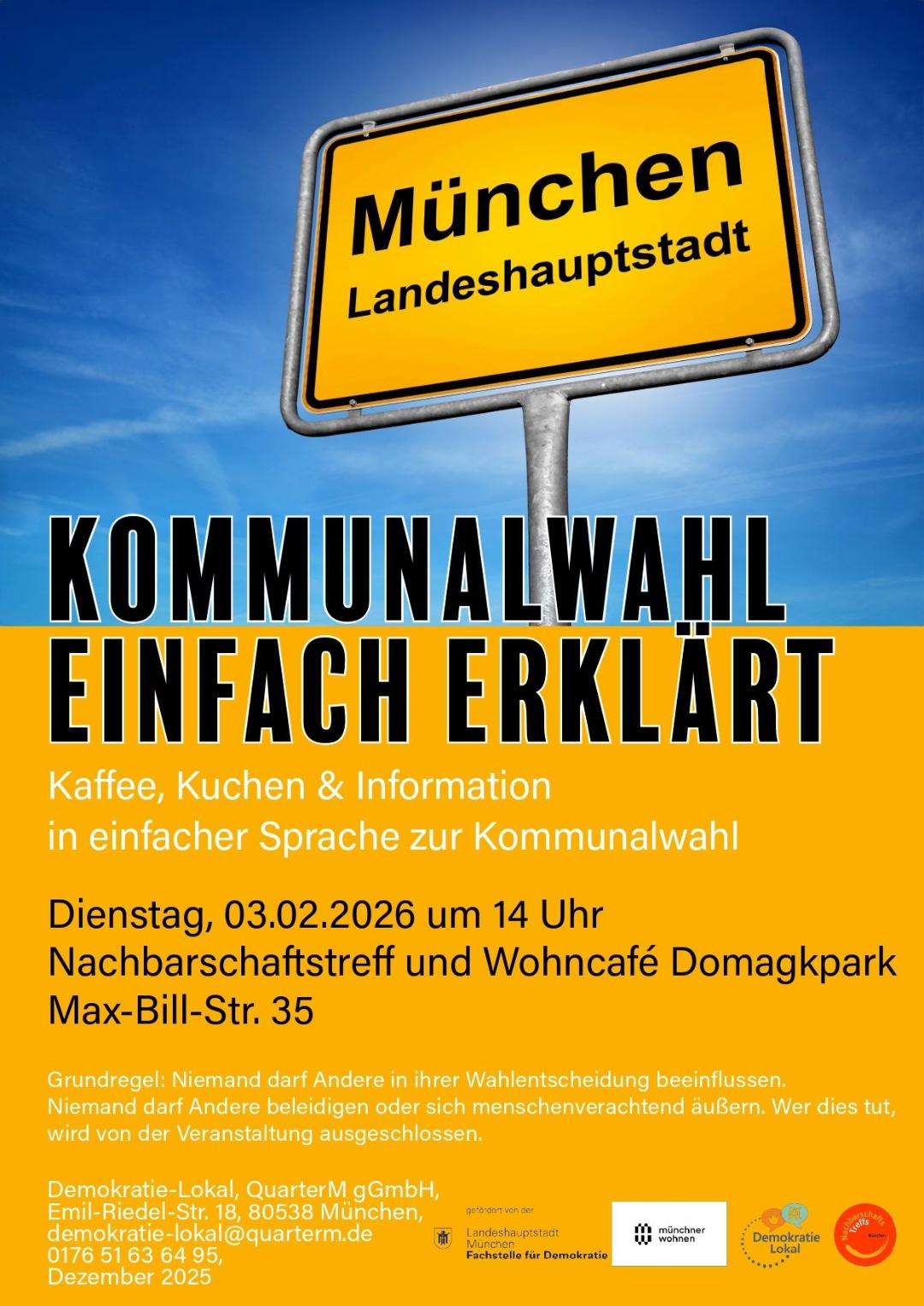 Im Nachbarschaftstreff Domagkpark, Max-Bill-Straße 35, informiert das Demokratie-Lokal München bei Kaffee & Kuchen über den Wahlvorgang und was Sie als Wähler*in zu den Kommunalwahlen am 08. März 2026 wissen müssen.